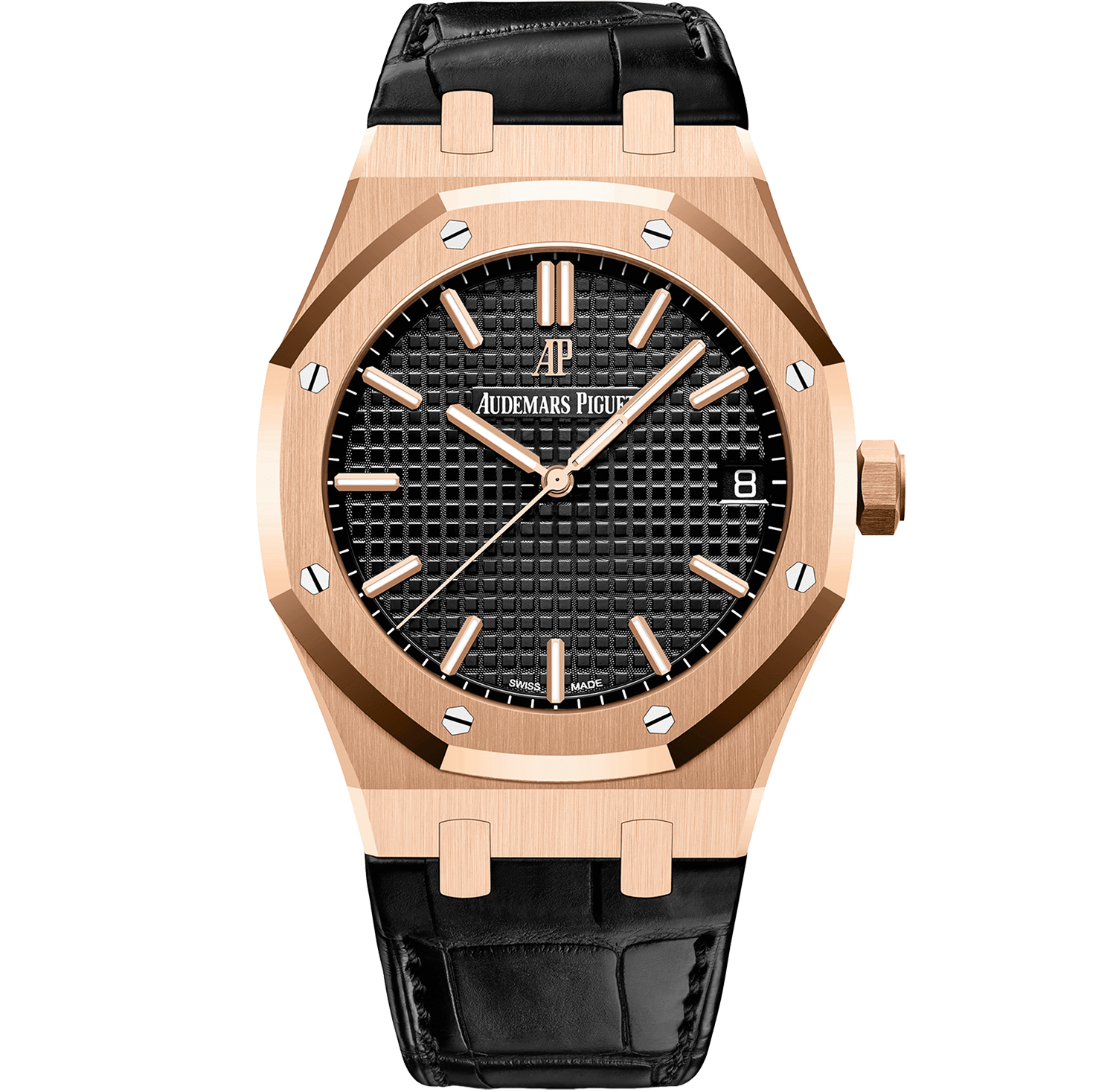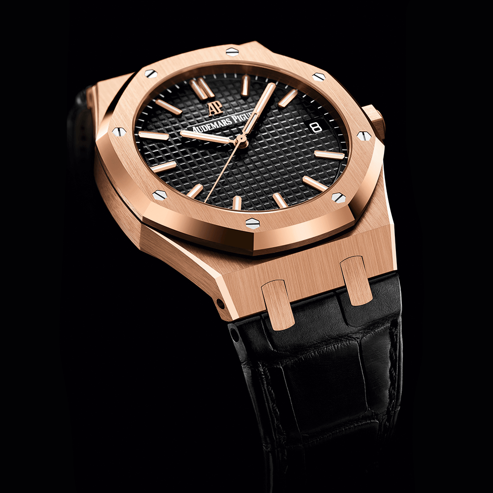 This pink gold Selfwinding Royal Oak with alligator strap offers new details: wider indexes, a minute train printed on the external area, and a date window further away from the centre.