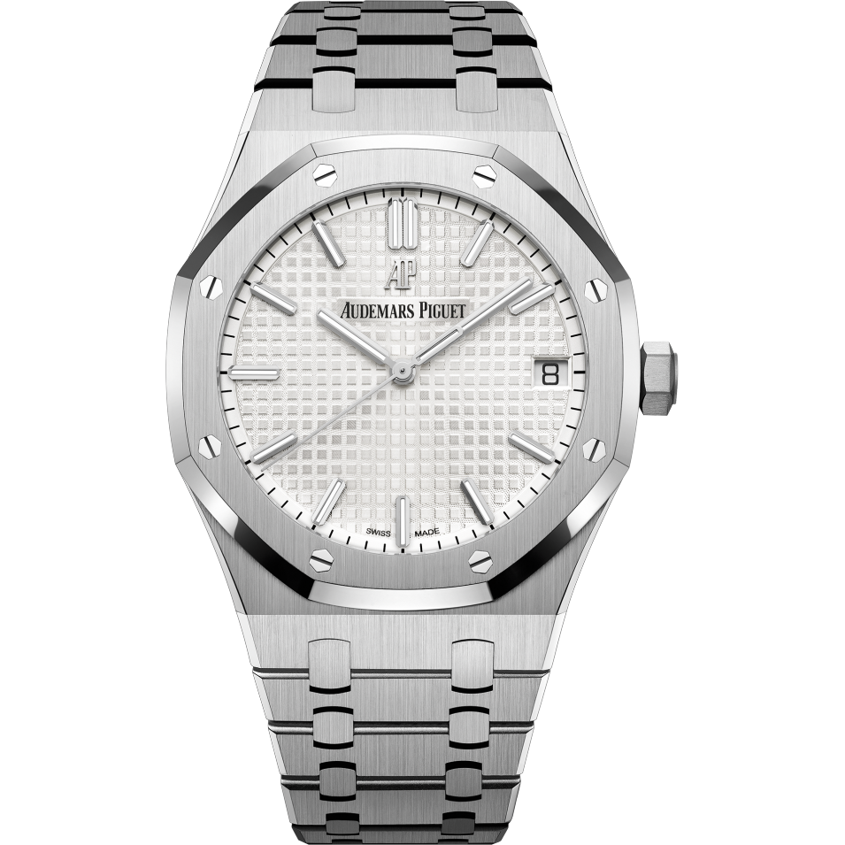 The Royal Oak’s silver-toned “Grande Tapisserie” dial enhances the stainless steel case and bracelet with a subtle play of light.