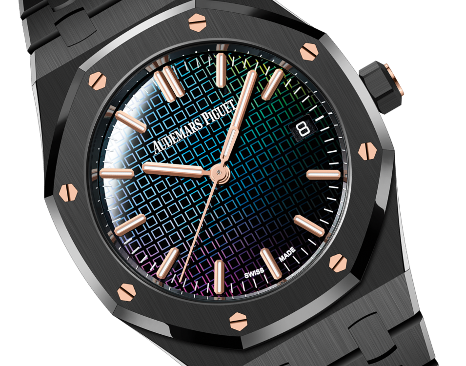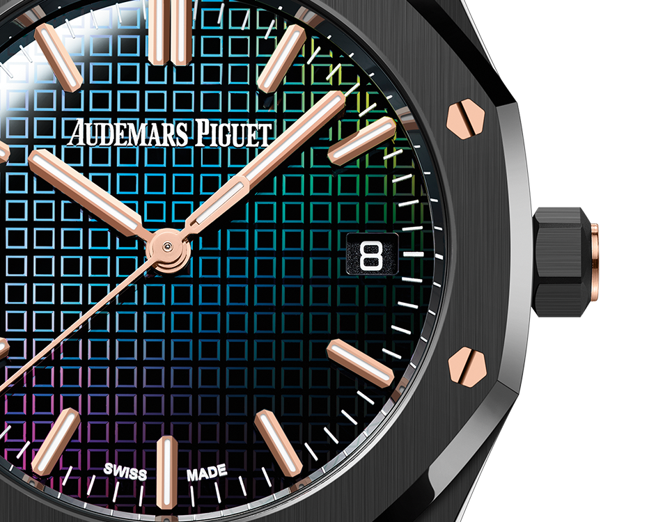 This 34 mm Royal Oak Selfwinding limited edition in black ceramic is the fruit of the Manufacture’s latest collaboration with Carolina Bucci. For the occasion, the jewellery designer has created a dial endowed with a unique multi-coloured mirror effect paying tribute to the iconic Tapisserie design.