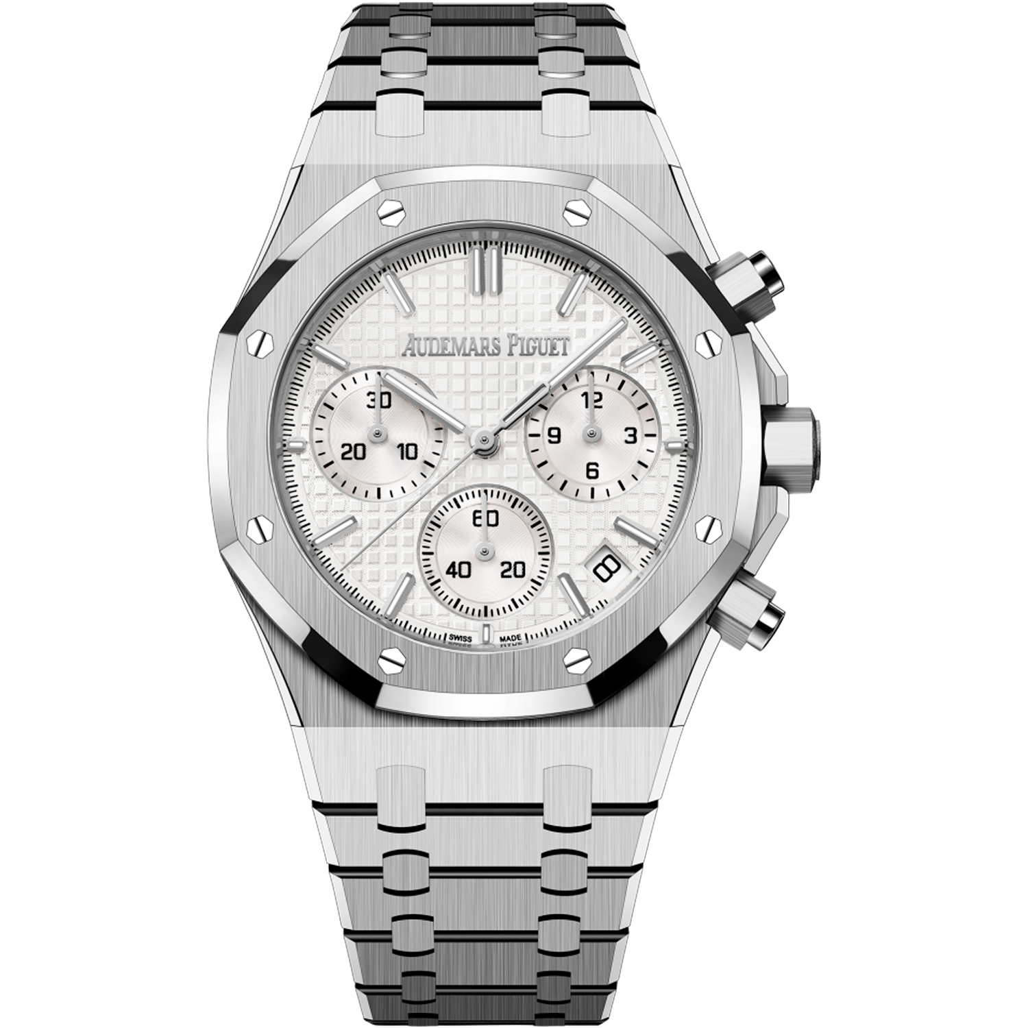 This 41 mm stainless steel Selfwinding Chronograph is adorned with a silver-toned “Grande Tapisserie” dial which nicely complements the watch’s slenderer aesthetic bestowed by the latest Royal Oak design evolution.