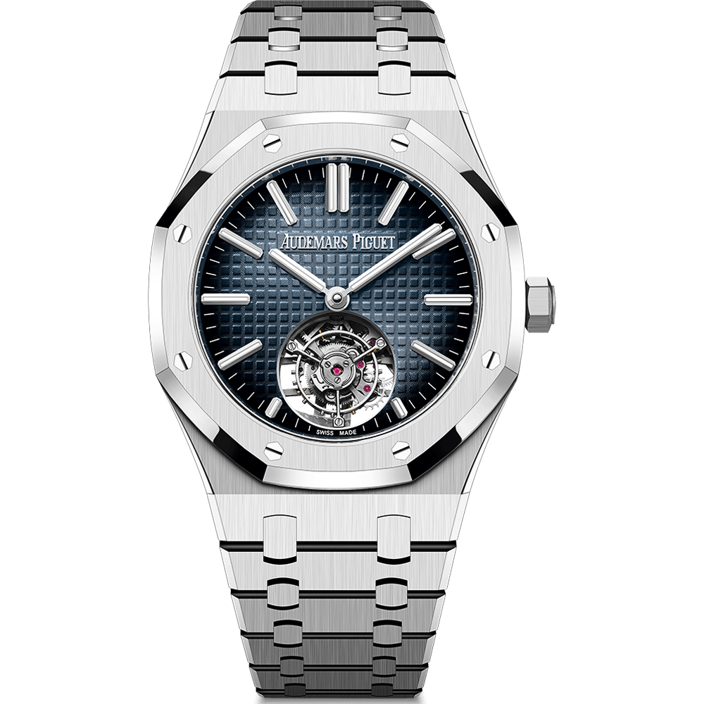 Endowed with the new Royal Oak design evolution, the stainless steel Selfwinding Flying Tourbillon adorns a smoked blue “Grande Tapisserie” dial. The sapphire caseback showcases the “50-years” oscillating weight.