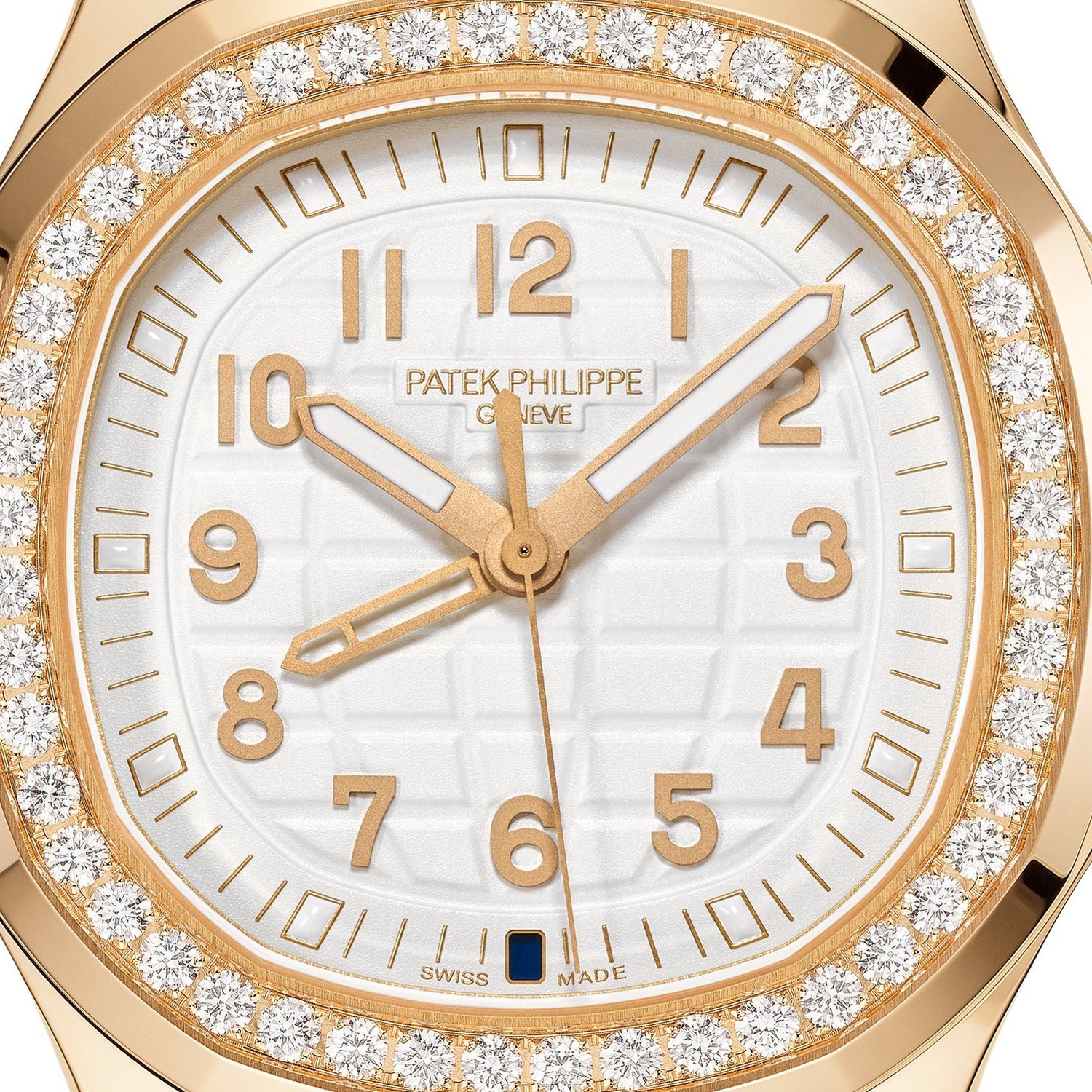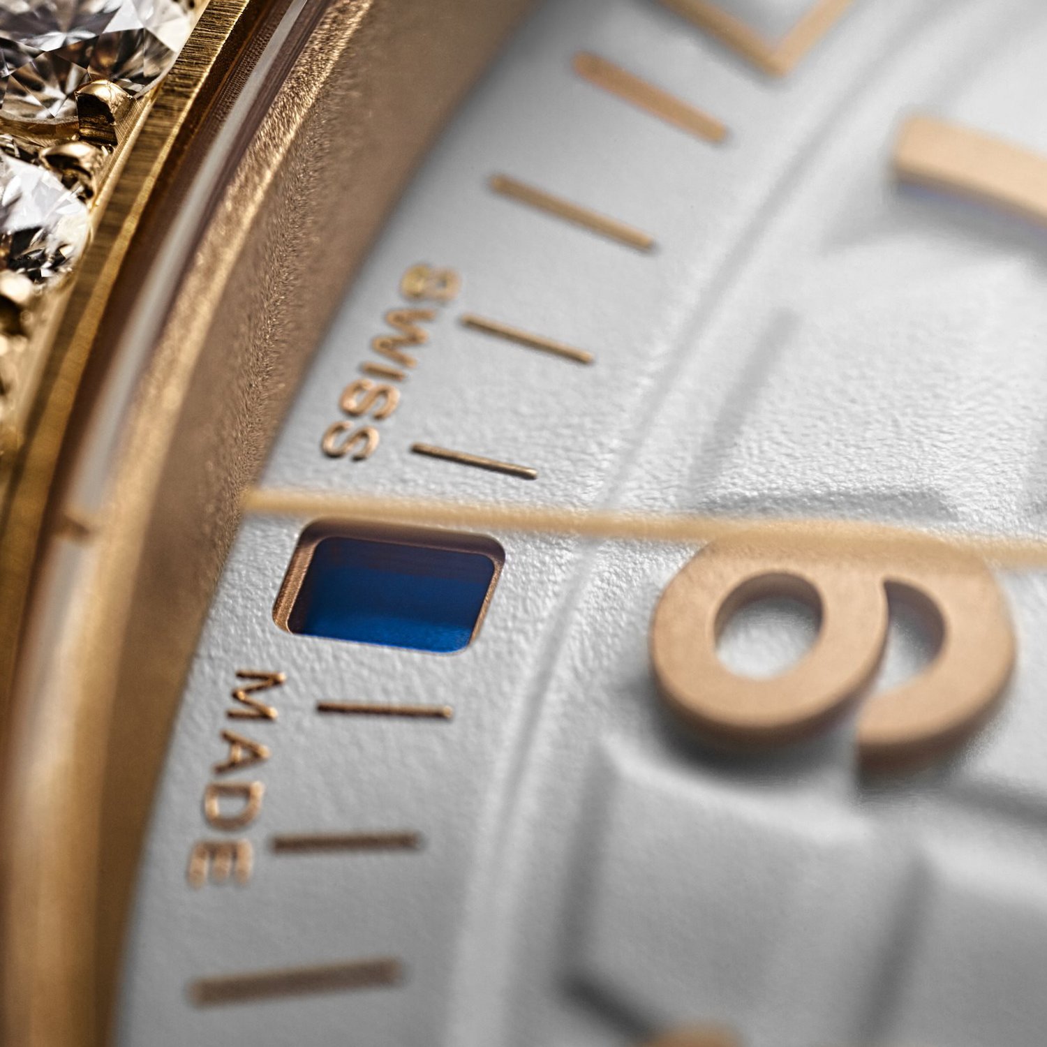 The horizontally embossed sunburst blue dial combines elegance and legibility, thanks to rose gold applied baton-style hour markers and rounded baton-style hands, all highlighted by a white luminescent coating.