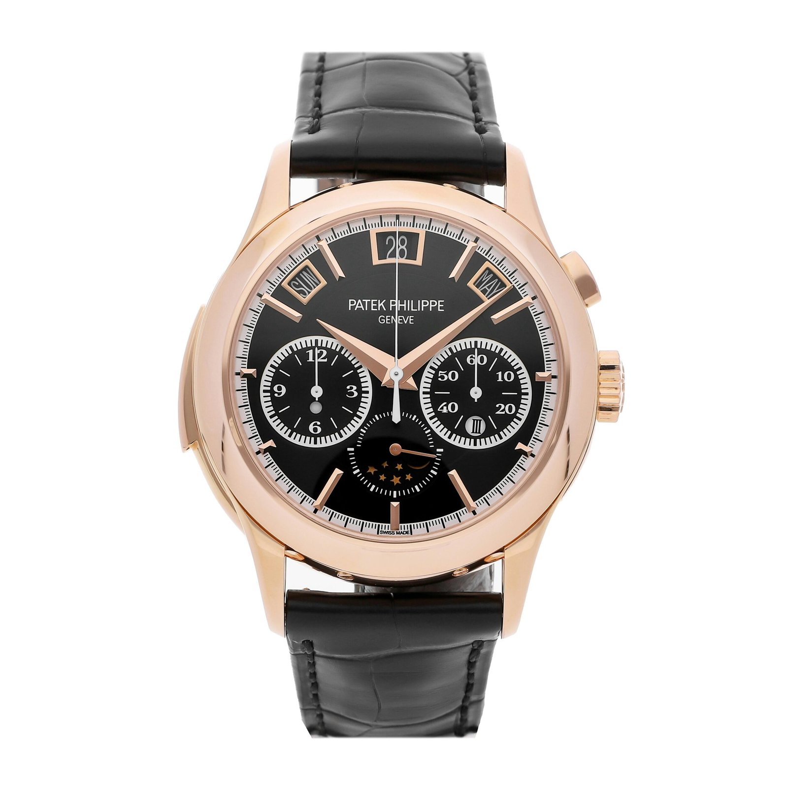 Patek Philippe has reinterpreted its Reference 5208 Grand Complication by housing it for the first time in a rose-gold case, paired with an ebony black sunburst dial. The 719-part movement, combining a minute repeater, a monopusher chronograph and an instantaneous perpetual calendar with aperture displays, is one of the rare ultra-complicated calibers to be self-winding. It can be admired through a sapphire-crystal case back.