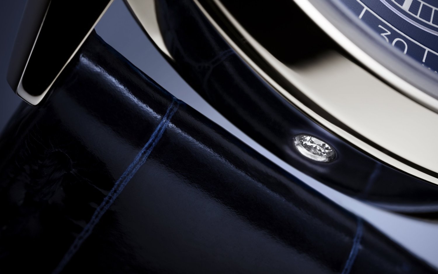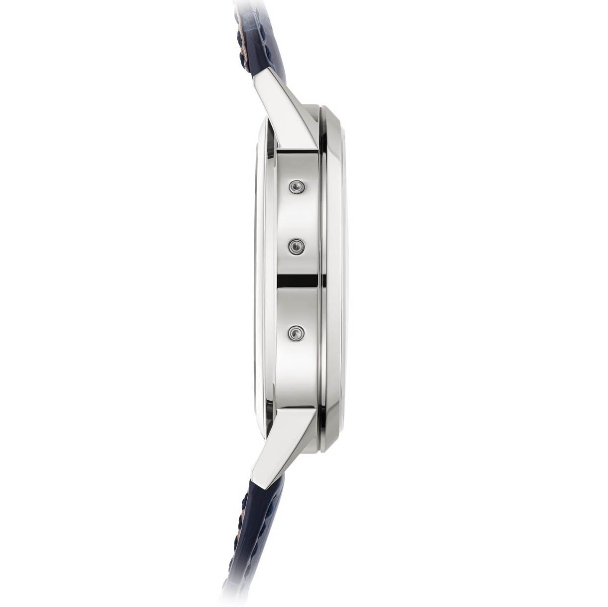 The horizontally embossed sunburst blue dial combines elegance and legibility, thanks to rose gold applied baton-style hour markers and rounded baton-style hands, all highlighted by a white luminescent coating.