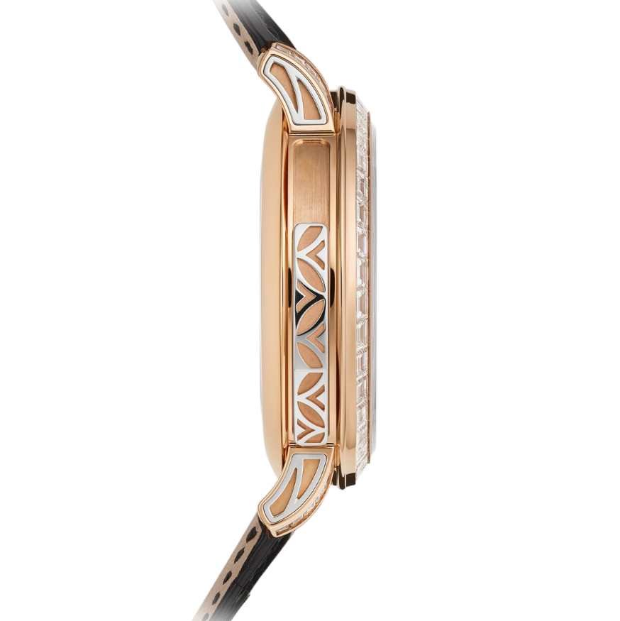 This model is equipped with self-winding 26-330 S C caliber featuring a stop-seconds function and a central 21K gold rotor adorned with the same horizontal motif as the dial.