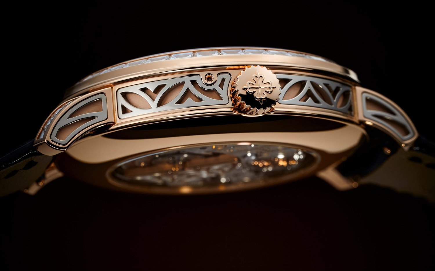 A miracle of transparency, the Reference 5304 self-winding Grand Complication with minute repeater and retrograde perpetual calendar is reinterpreted in a new rose gold version. This highlights the ingenious calendar display system with sapphire disks. The “leaf” motif engraved on the white gold inserts adorning the sides of the case is echoed on the off-center rose gold mini-rotor visible through the transparent case back.