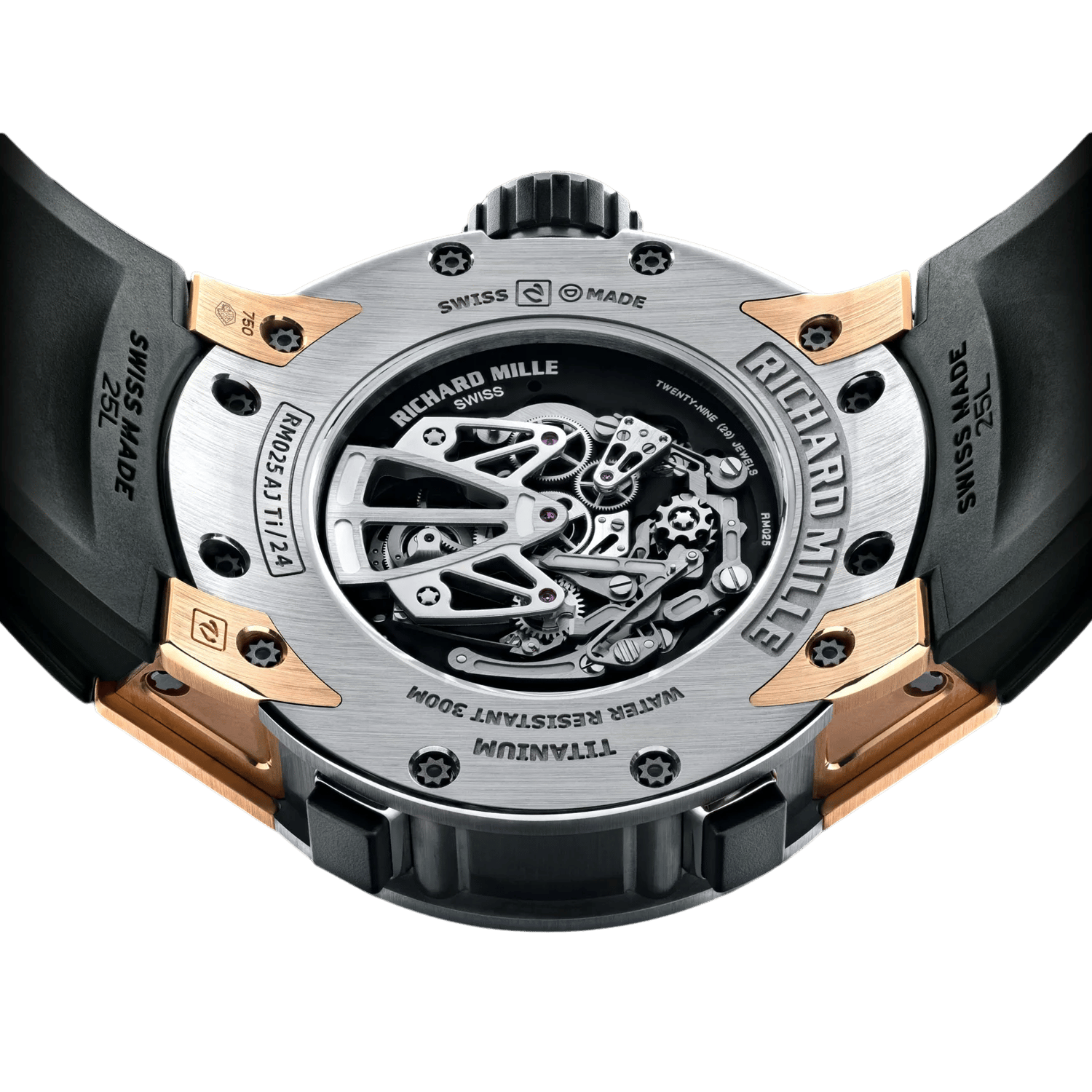 The Richard Mille RM 025 AJ Ti Manual Winding Tourbillon Chronograph is a highly advanced diver’s watch that blends complex horological features with robust materials. It features a 50.7mm titanium case and is water-resistant up to 300 meters, making it a reliable choice for underwater activities. The watch includes a manual-winding movement with a tourbillon and chronograph complication, powered by the RM025 caliber, which has a power reserve of approximately 50 hours.