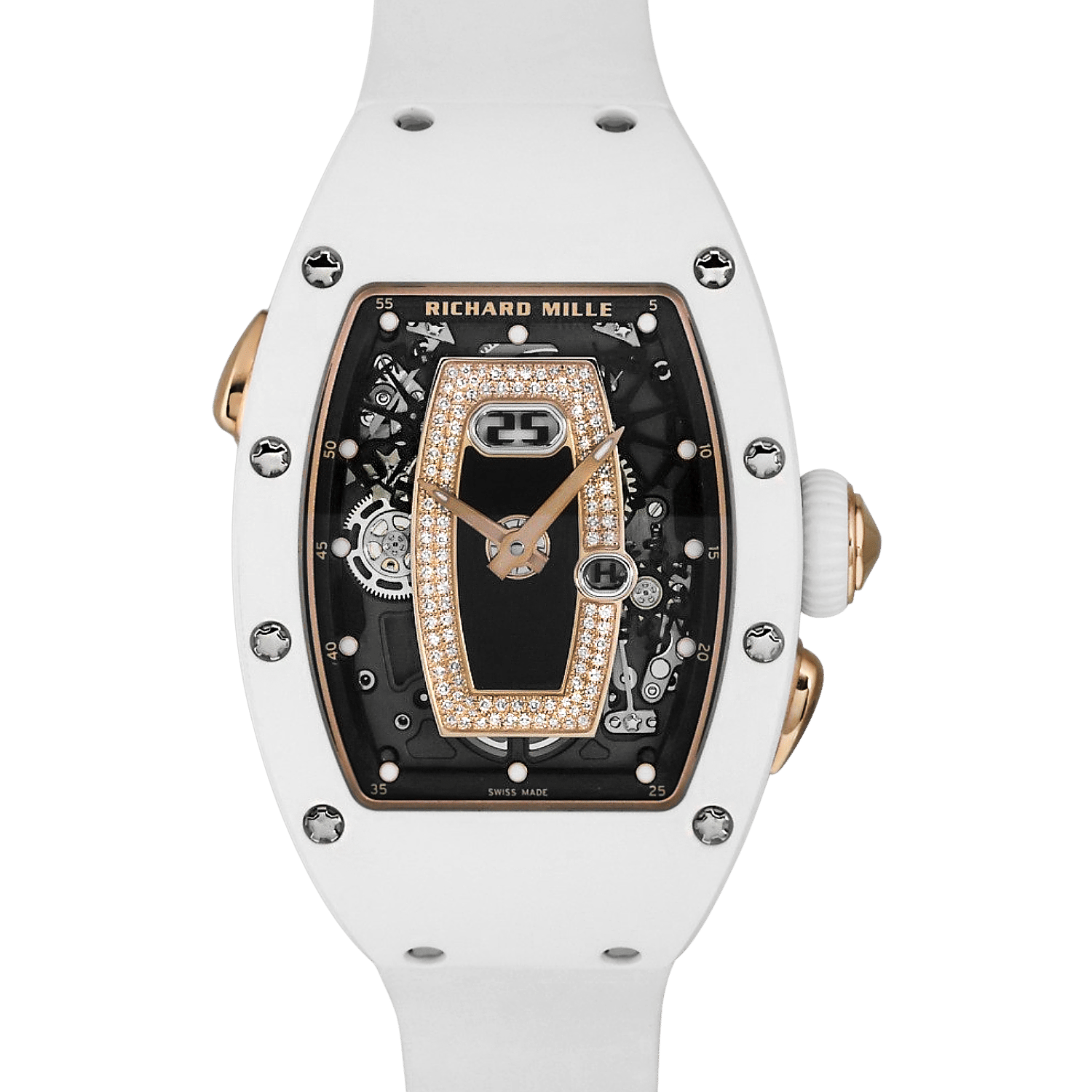 The Richard Mille RM 037 RG ATZ White is a sophisticated women’s watch combining advanced horological engineering with refined aesthetics. It features a 34mm rose gold case and a white ATZ ceramic bezel and caseback, which is highly resistant to scratches and shocks. The watch is powered by the CRMA1 automatic movement and offers a power reserve of around 50 hours.