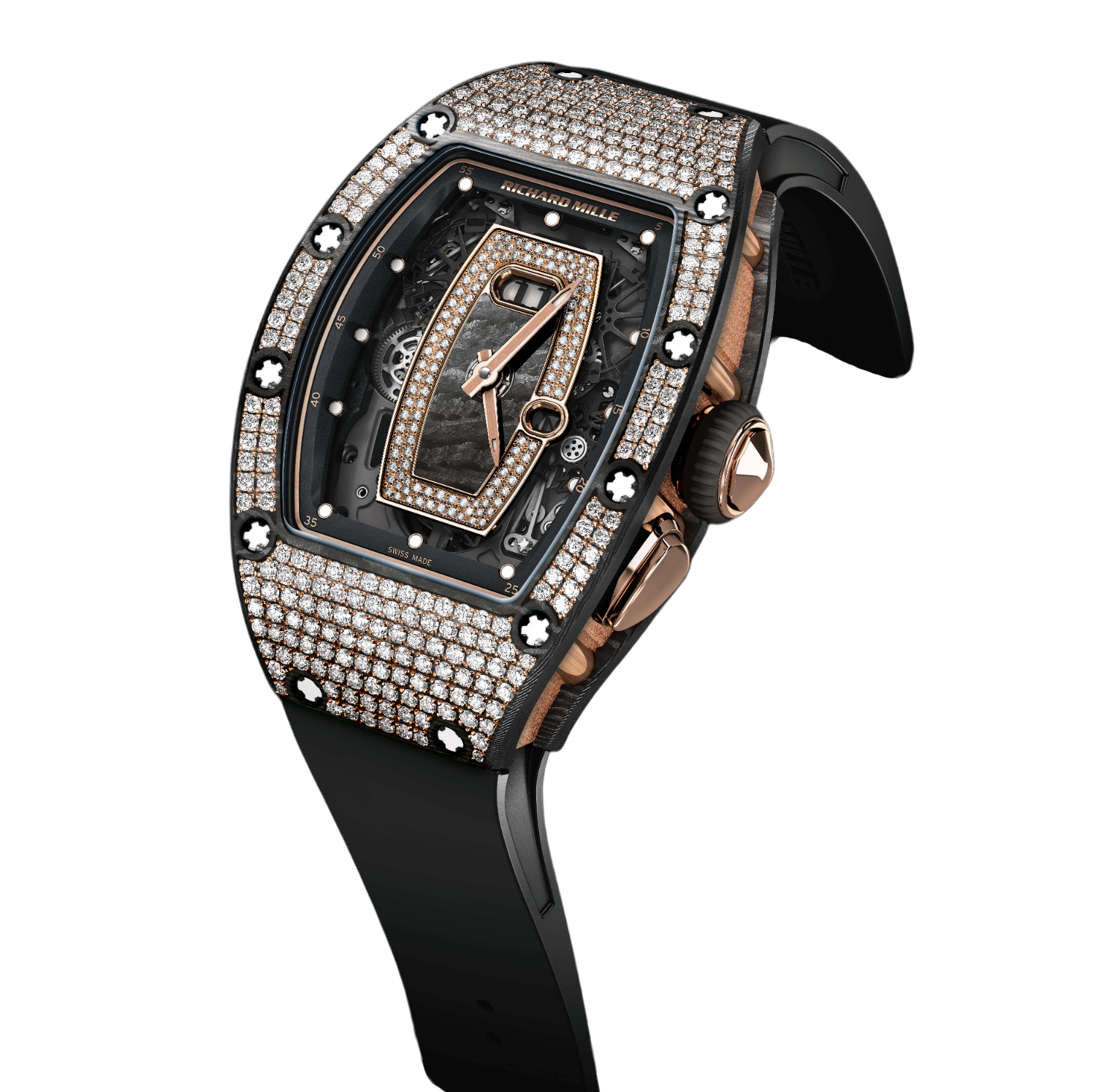The Richard Mille RM 037 RG CA ONYX is a sophisticated women’s watch featuring a combination of Carbon TPT® and rose gold. It is powered by a self-winding automatic movement and has a power reserve of approximately 50 hours. The watch includes several complications such as hours, minutes, an oversized date display, and a function selector, providing versatility and practicality.