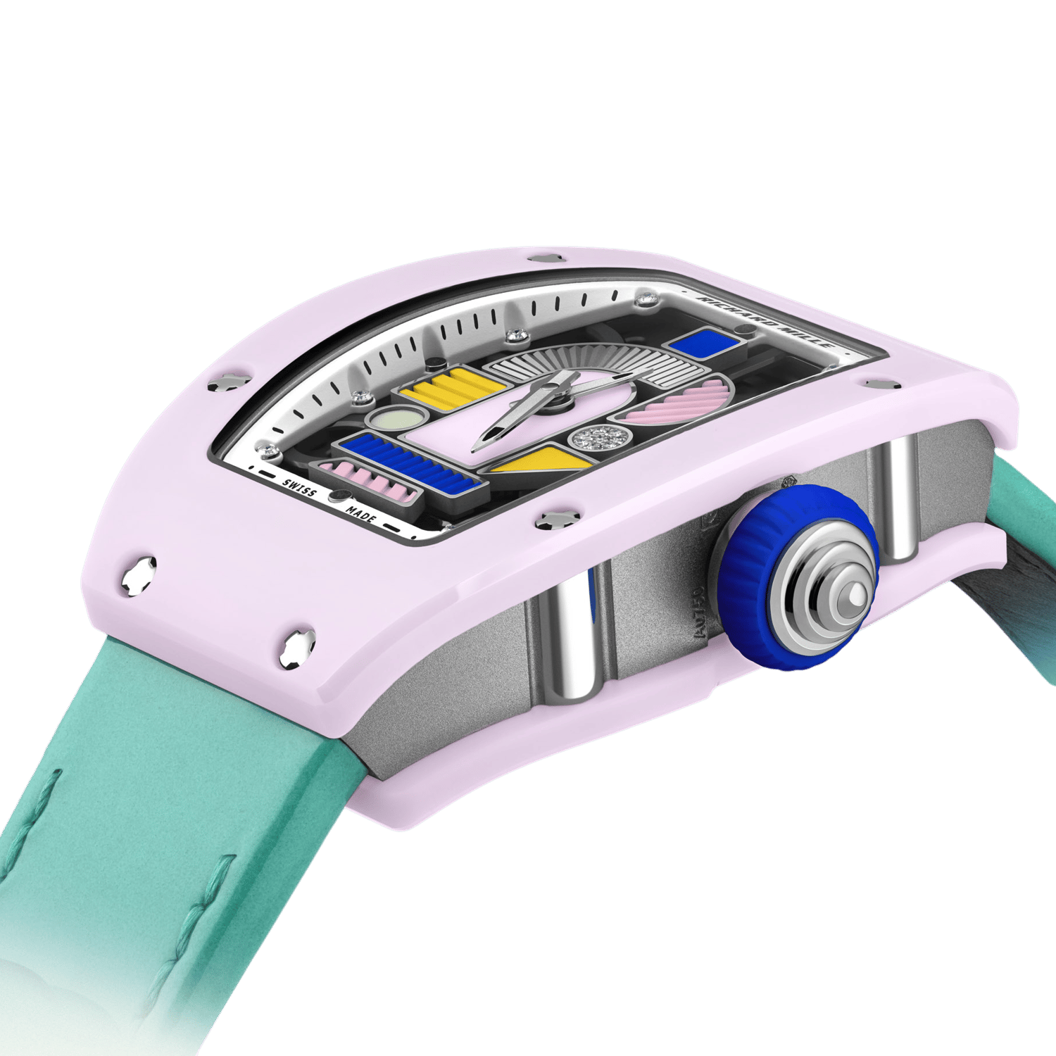The Richard Mille RM 07-01 Coloured Ceramics Pastel Pink Limited Edition is a distinctive timepiece inspired by the Memphis Design movement of the 1980s, known for its playful use of geometric shapes and bold colors. This watch is part of a trio that includes pastel lavender and pastel blue models.