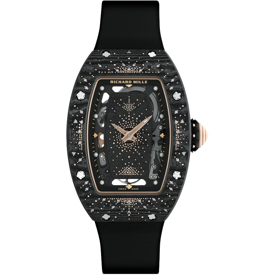 The Richard Mille RM 07-01 Intergalactic “Dark Night” is a part of the Intergalactic collection, designed to evoke the mystery and beauty of the cosmos. This luxurious timepiece features a Carbon TPT® case and a diamond-set bezel accented by red gold prongs. The watch is powered by the CRMA2 automatic winding movement, known for its robustness and precise timekeeping. The case dimensions are 31.4mm x 45.66mm, with an open caseback and a black rubber strap for a refined yet sporty look.