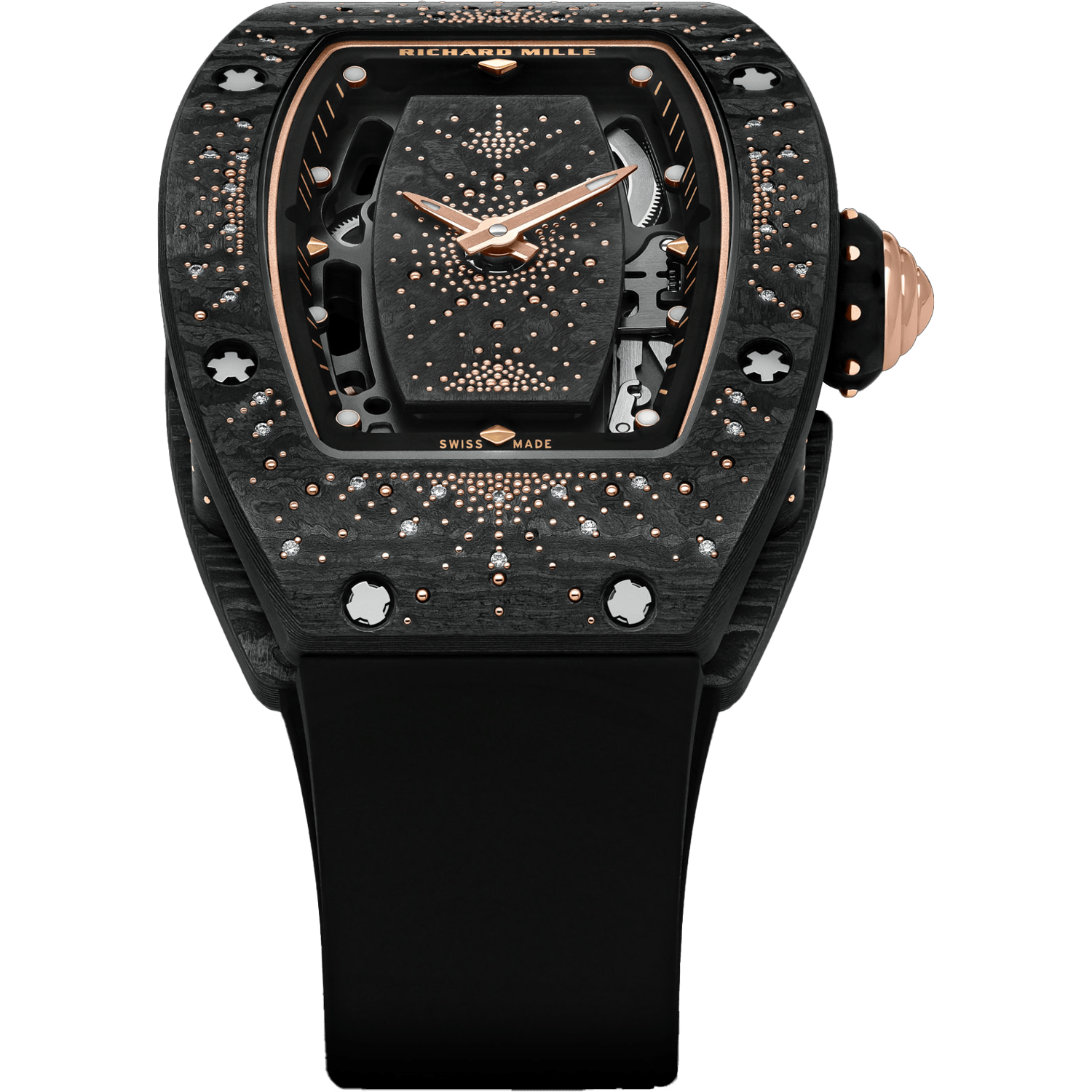 The “Dark Night” variant stands out with its use of polished 5N red gold for the prongs and crown, contrasting against the matte black Carbon TPT® and creating a stunning visual effect that symbolizes constellations in the night sky. The watch offers a power reserve of approximately 50 hours and is water-resistant up to 50 meters. The design aims to capture the allure of an “explosion of stars” as envisioned by Richard Mille’s Creative and Development Director, Cécile Guenat.