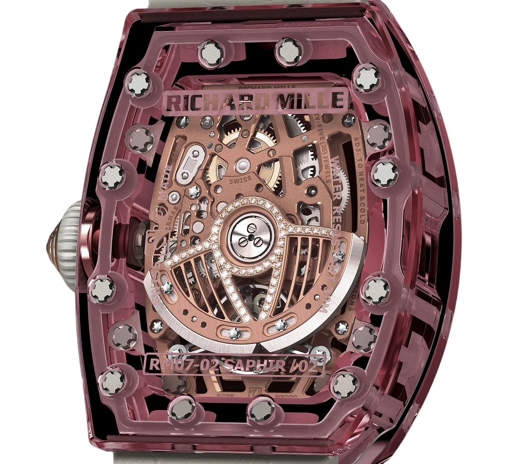 The Richard Mille RM 07-02 Automatic Winding Sapphire is a high-end women’s watch that exemplifies elegance and sophistication through its unique use of colored sapphire and gem-setting technology. It features a skeletonized automatic-winding movement (CRMA5 caliber) encased in a sapphire case with prongs made of red or white gold, set with diamonds.