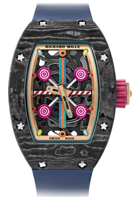 The front bezel of the RM 07-03 Myrtille is made from Carbon TPT® and its caseback employs a new turquoise Quartz TPT®.
