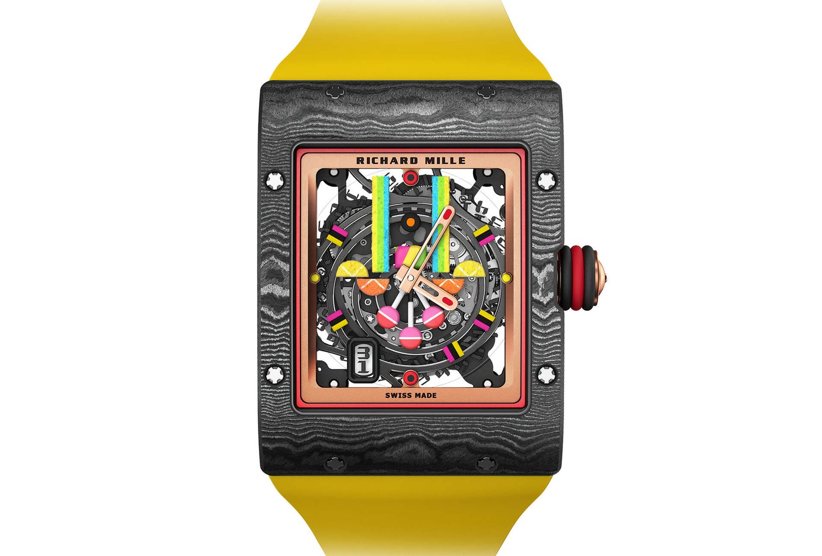 The front bezel of the RM 16-01 Fraise is made from Carbon TPT® and its caseback uses red Quartz TPT®. The caseband uses a gradient of Carbon TPT®/red Quartz TPT®, creating an elegant colour transition from the bezel to the caseback.