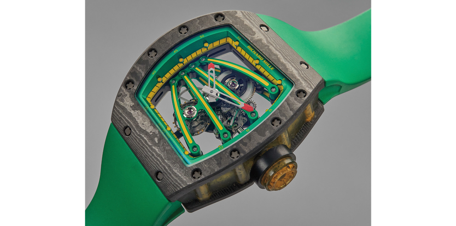 The RM 59-01 impresses immediately, and is one of the most iconic watches ever made by Richard Mille. The watch is lightweight and was designed for Yohan Blake, the second fastest man in history and one of the leading athletes of our time. The bridges spanning the movement are designed to evoke the claws of ‘The Beast’, Yohan Blake’s nickname, and embodies the colours of his Jamaican homeland. The dynamic bridges are made from anticorodal aluminum and support the tourbillon cage, consolidating the grade 5 titanium baseplate. As with all Mille timepieces, the RM59-01 is designed to be worn under extreme circumstances, in this case 100m competitive sprinting.