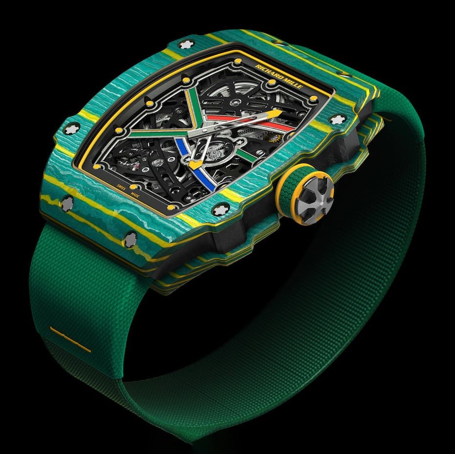 Thin, lightweight, coloured, elegant and athletic, the RM 67-02 is the watch for any situation. Breaking with precedent, Richard Mille designed this model so that it can be adapted to various sporting disciplines. This is why several of the brand’s partners have had developed an RM 67-02 in the colours of their respective countries, so as to test the abilities of this automatic calibre in a range of settings.